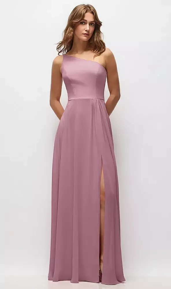 One-Shoulder Chiffon Maxi Dress with Shirred Front Slit