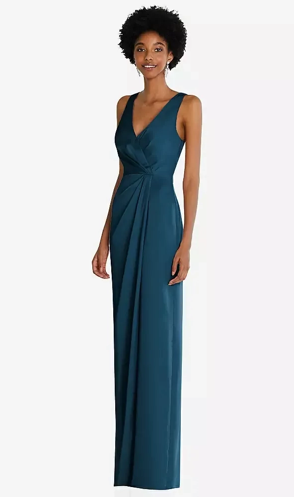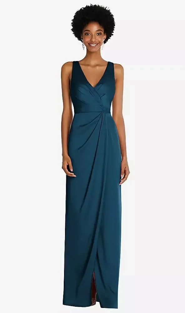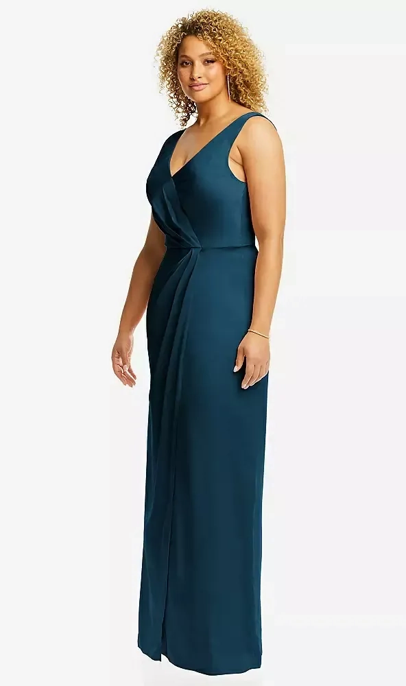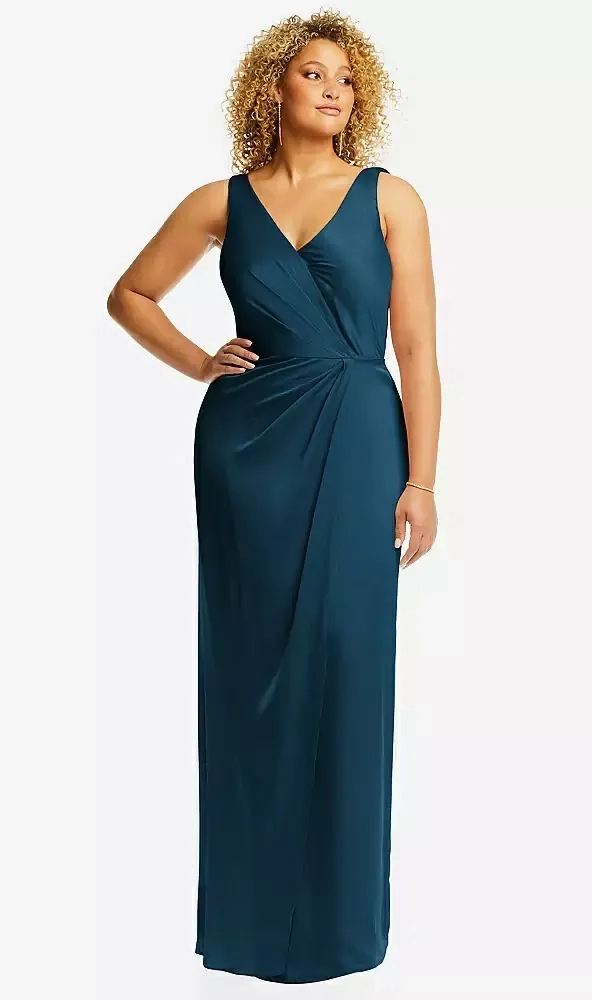 Elevate your special occasion style with this exquisite maxi dress, designed to make a lasting impression. It boasts a beautifully structured faux wrap bodice that complements a variety of figures, flowing gracefully into a meticulously draped tulip skirt. Perfect for bridesmaids seeking comfort and sophistication, or for making a grand entrance at prom or any formal event, this gown is a true showstopper.