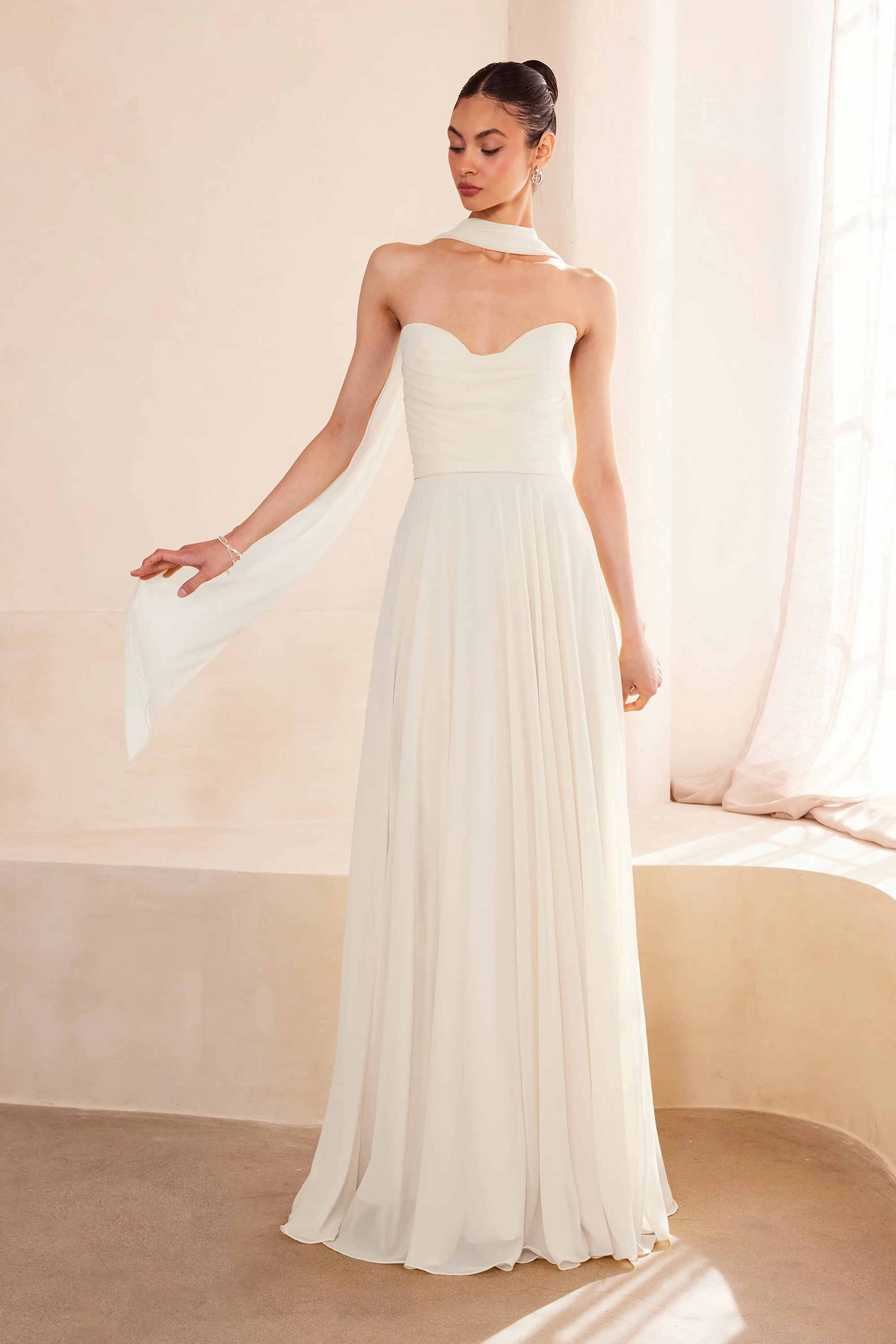 This romantic chiffon gown is designed for the modern bride who loves softness, movement, and effortless elegance. Crafted in double-lined chiffon, it features a beautifully draped bodice paired with a sweetheart neckline that flatters every frame. The flowing A-line skirt offers airy, graceful movement, while the removable chiffon scarf adds a touch of ethereal charm—perfect for bridal portraits or a soft ceremony look. The lace-up corset back ensures an adjustable fit and sculpted waistline, offering comfort and structure without compromising on delicacy. Ideal for garden weddings, civil ceremonies, destination weddings, and romantic celebrations, this gown blends timeless femininity with modern versatility. Key Features: Silhouette: A-line Design: Sweetheart neckline, draped bodice & removable chiffon scarf Fabric & Material: Double-lined chiffon Fit Detail: Lace-up corset back, adjustable fit, fully lined Occasions: Perfect for weddings, elopements, beach weddings, civil ceremonies, bridal portraits & romantic celebrations Closure: Lace-up back