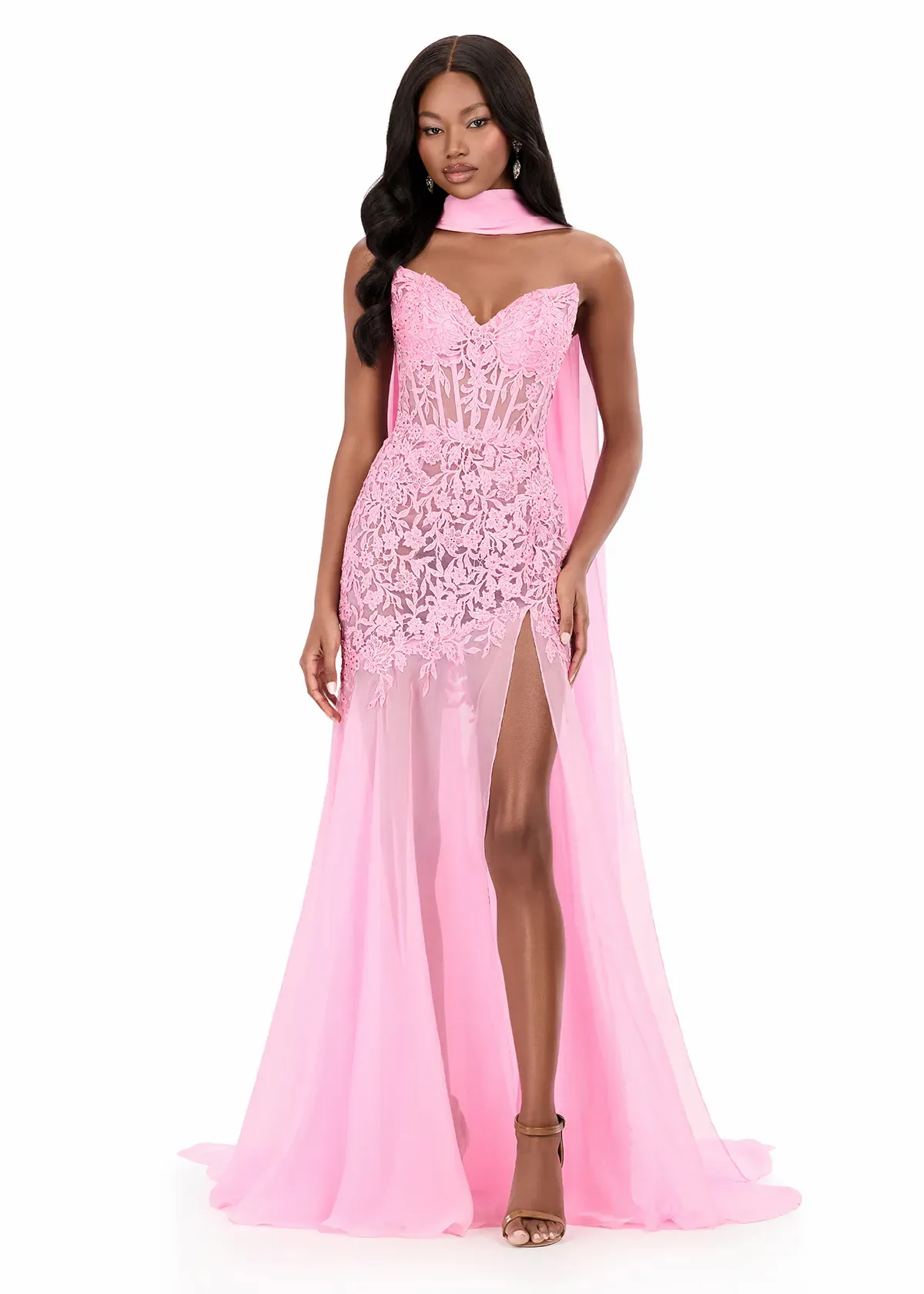 Special Features:Applique embellishments, Detachable Cape, High leg slit, Lace details, Sheer bodice, Sweep train