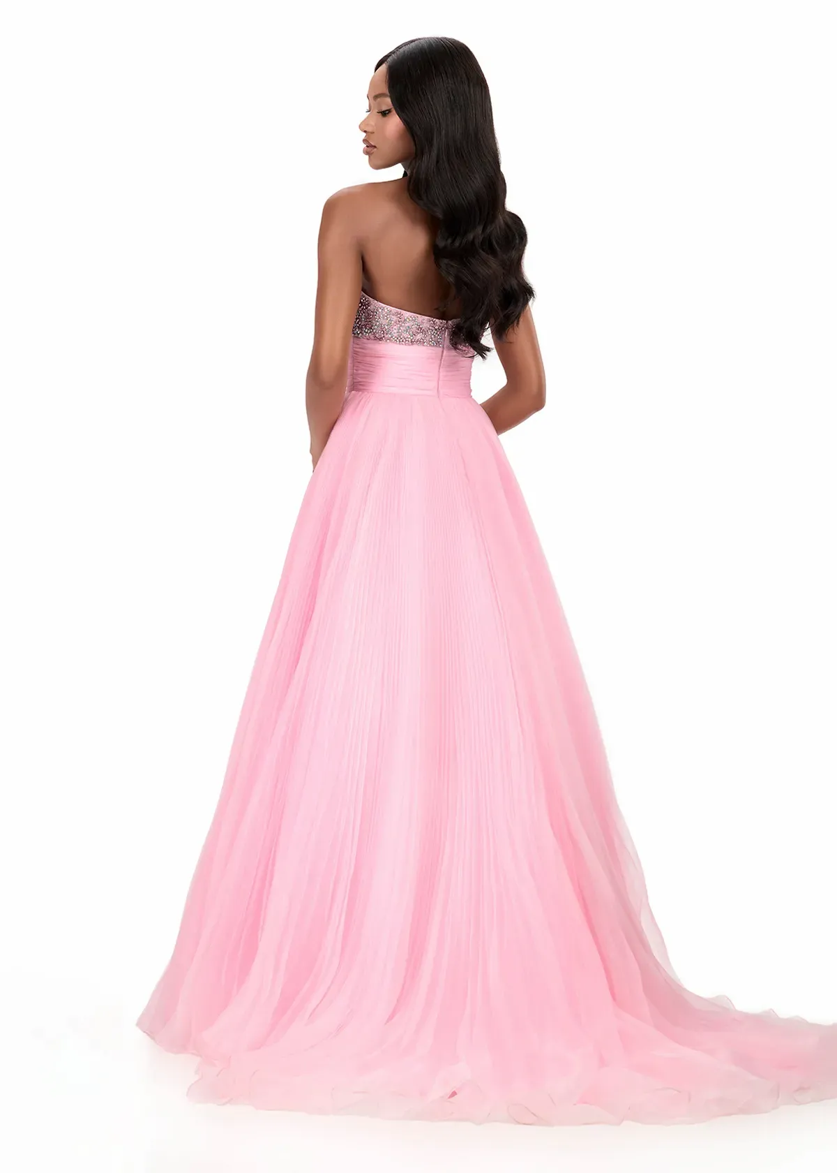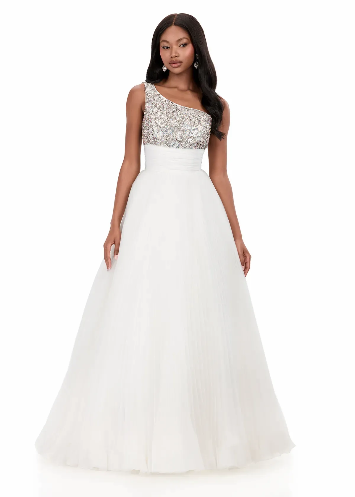 Pleated Organza Ballgown - One Shoulder Beaded Dress