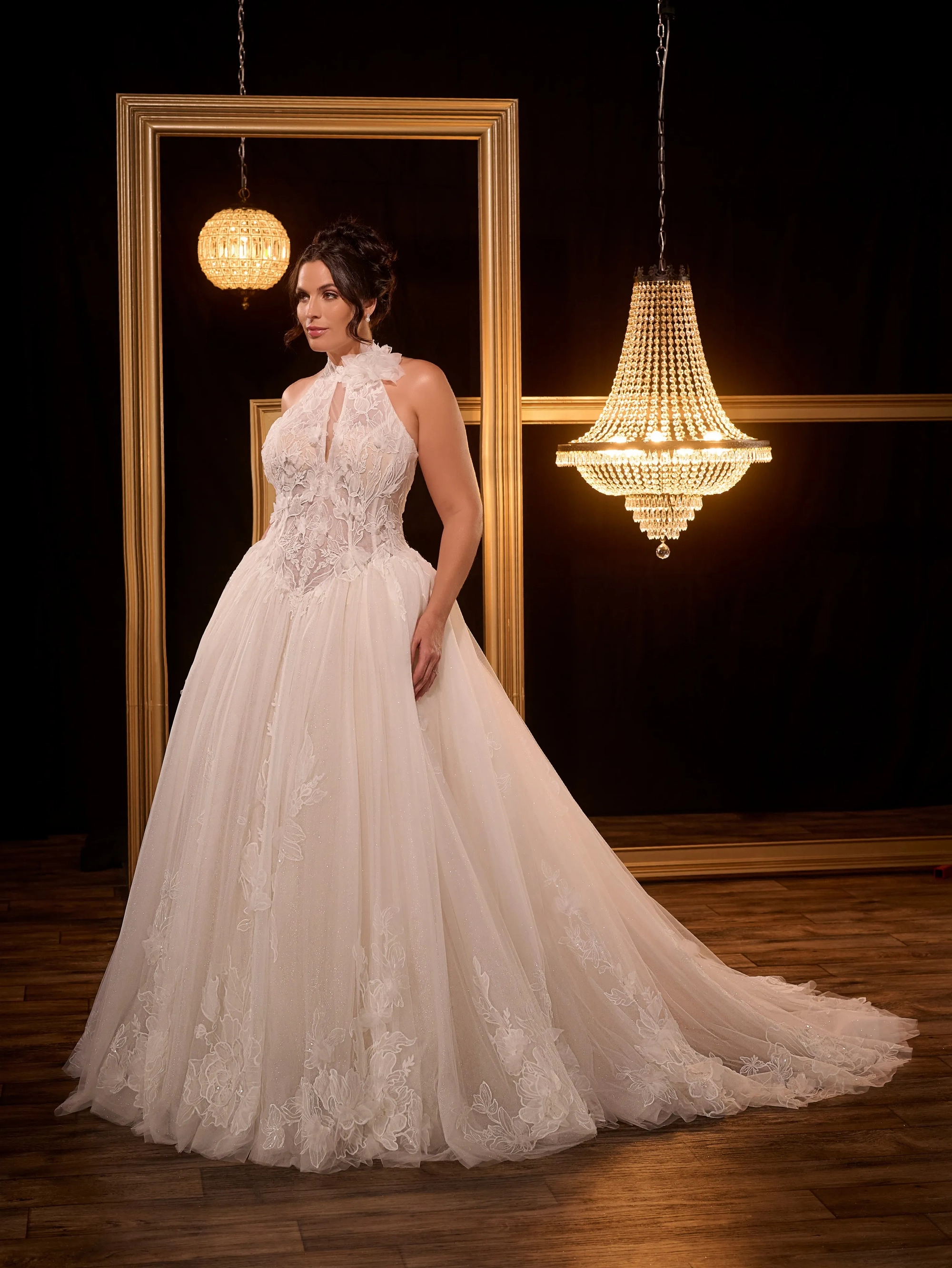 Ball gown in lace with semi-sheer bodice and halter neck, decorated with 3D flower on side. Nude plunging illusion on cf bodice. Buttons/zipper back closure.
