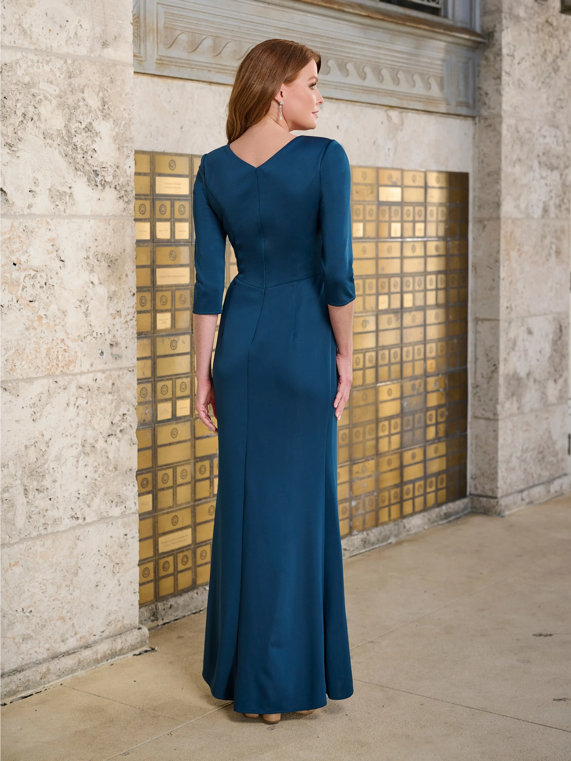 Slim style in scuba like jersey fabric, has V-neck, side draping and peplum on front skirt. Invisible zipper back dress closure, short sweep train.