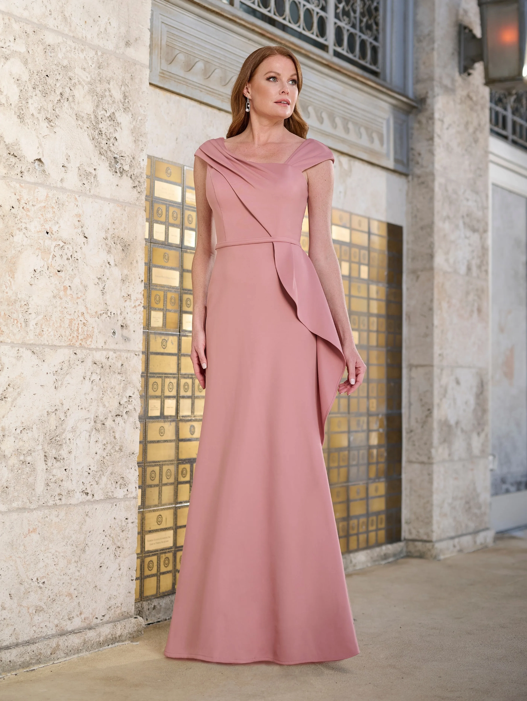 Slim style in scuba like jersey fabric with asymmetrical neckline and straps covering the tip of the shoulders. Side draping on the bodice flows down onto the skirt to become side skirt draping. Narrow waist trim. Invisible zipper back closure. Short sweep train.