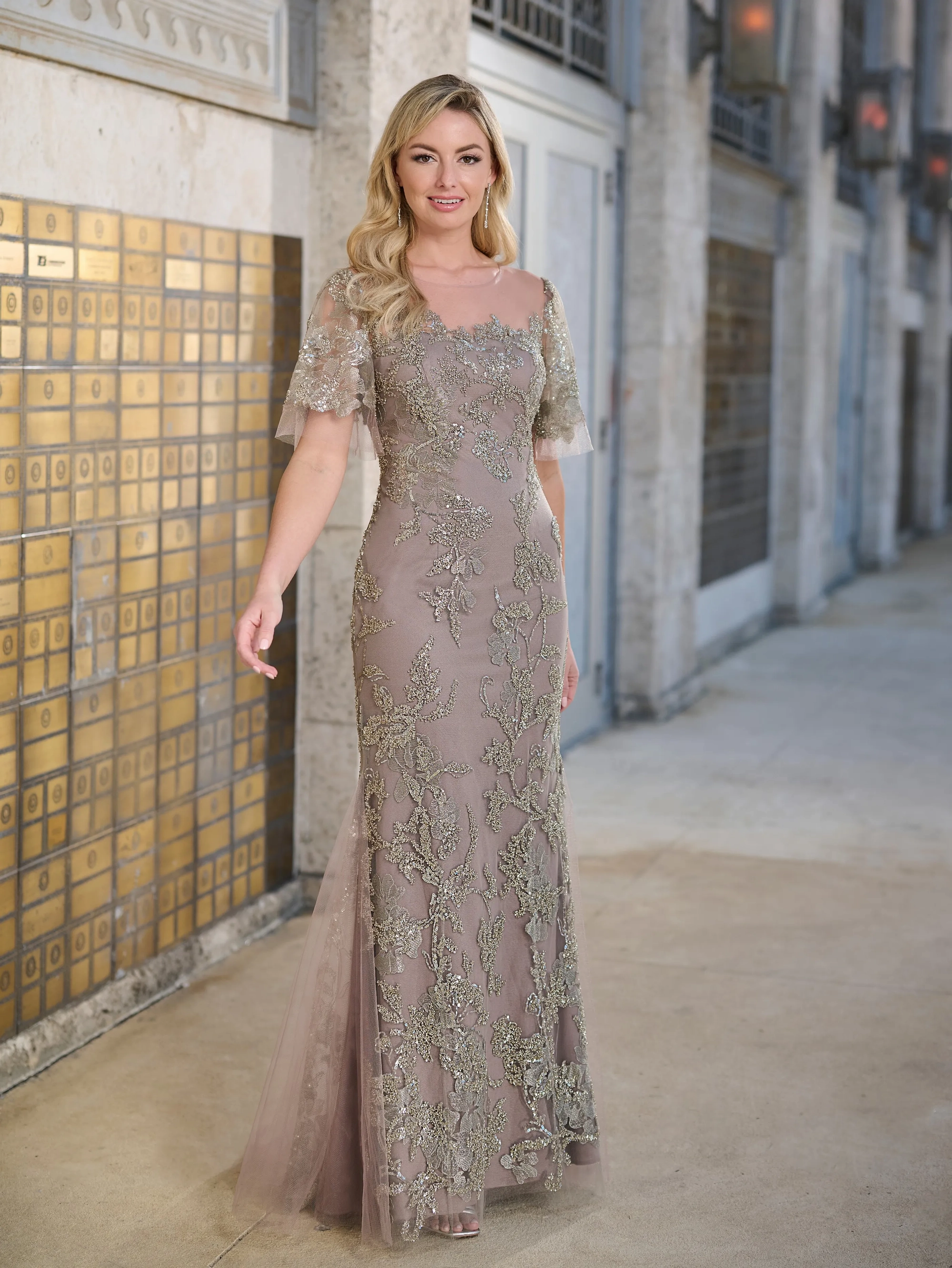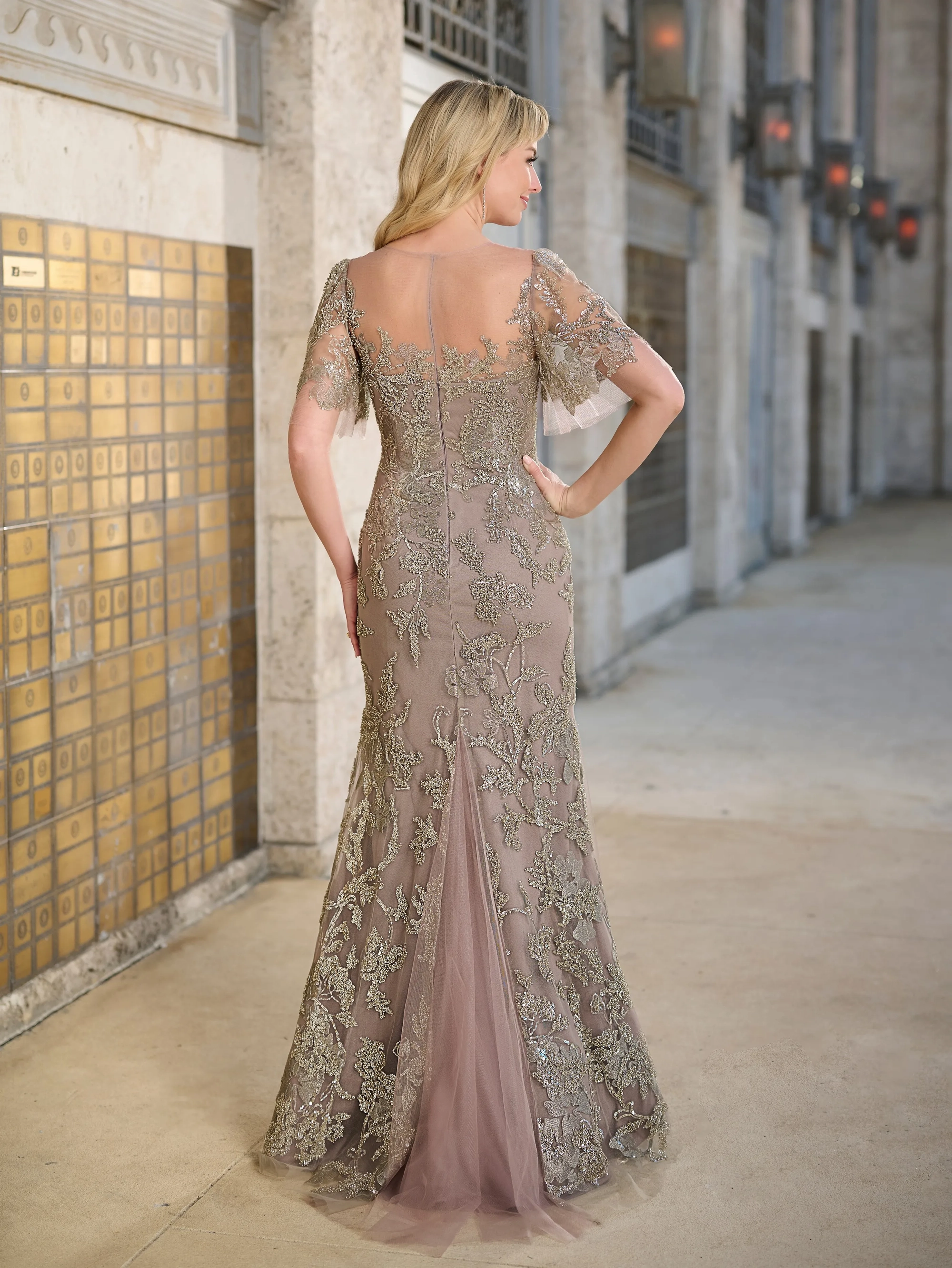 Slim dress in beaded all over lace with illusion on shoulders and with frill sleeves. Delicate tulle godets inserts on side and back skirt. Invisible zipper back dress closure. Short sweep train.