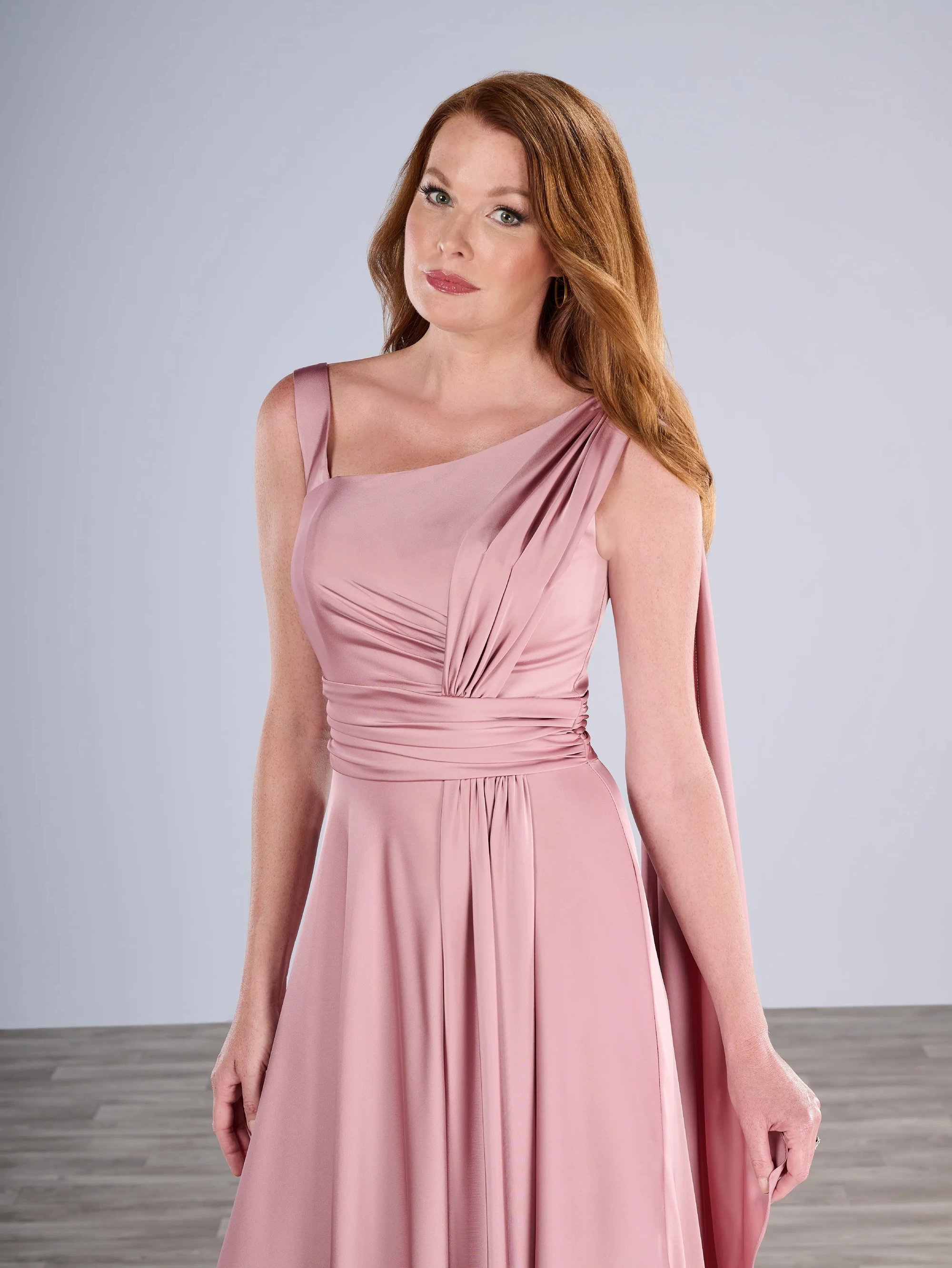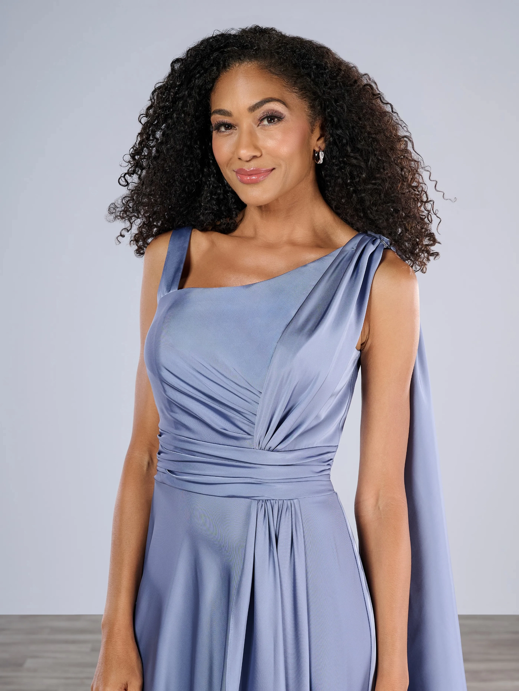 A-line gown in stretch charmeuse with asymmetrical shoulder and side front draping has detachable long pleated streamer hanging at the back shoulder.