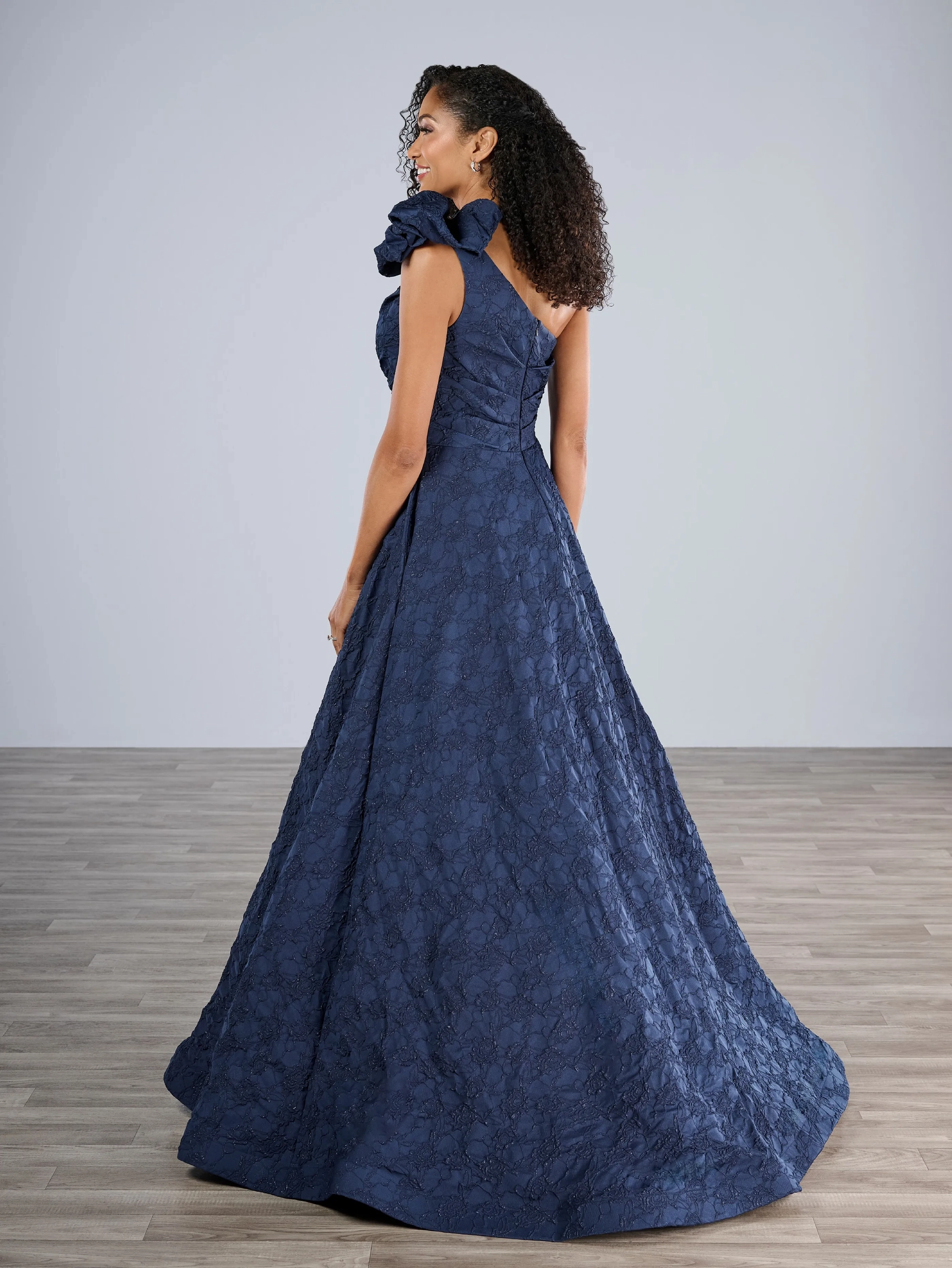 One shoulder A-line gown in textured brocade features modern ruching on the shoulder point.