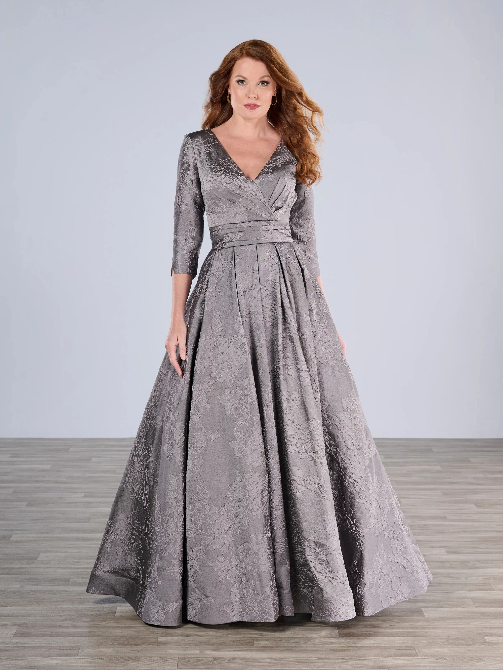 This V-neck A-line gown in textured brocade has a soft shimmer and 3/4 sleeves. A soft pleated wrap on front of bodice is finished with a pleated waistband.