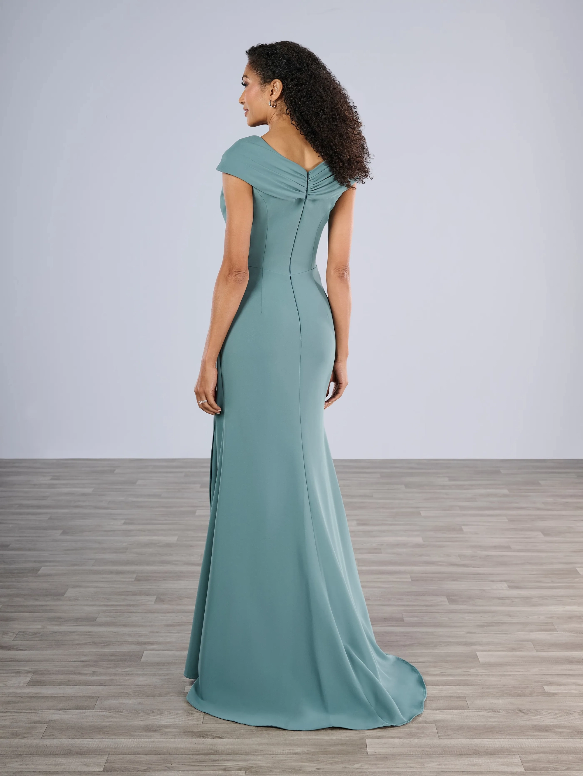 This slim style in stretch crepe has a pleated V collar covering the tips of the shoulders. Soft pleating across stomach with side drape on skirt finishes the look.