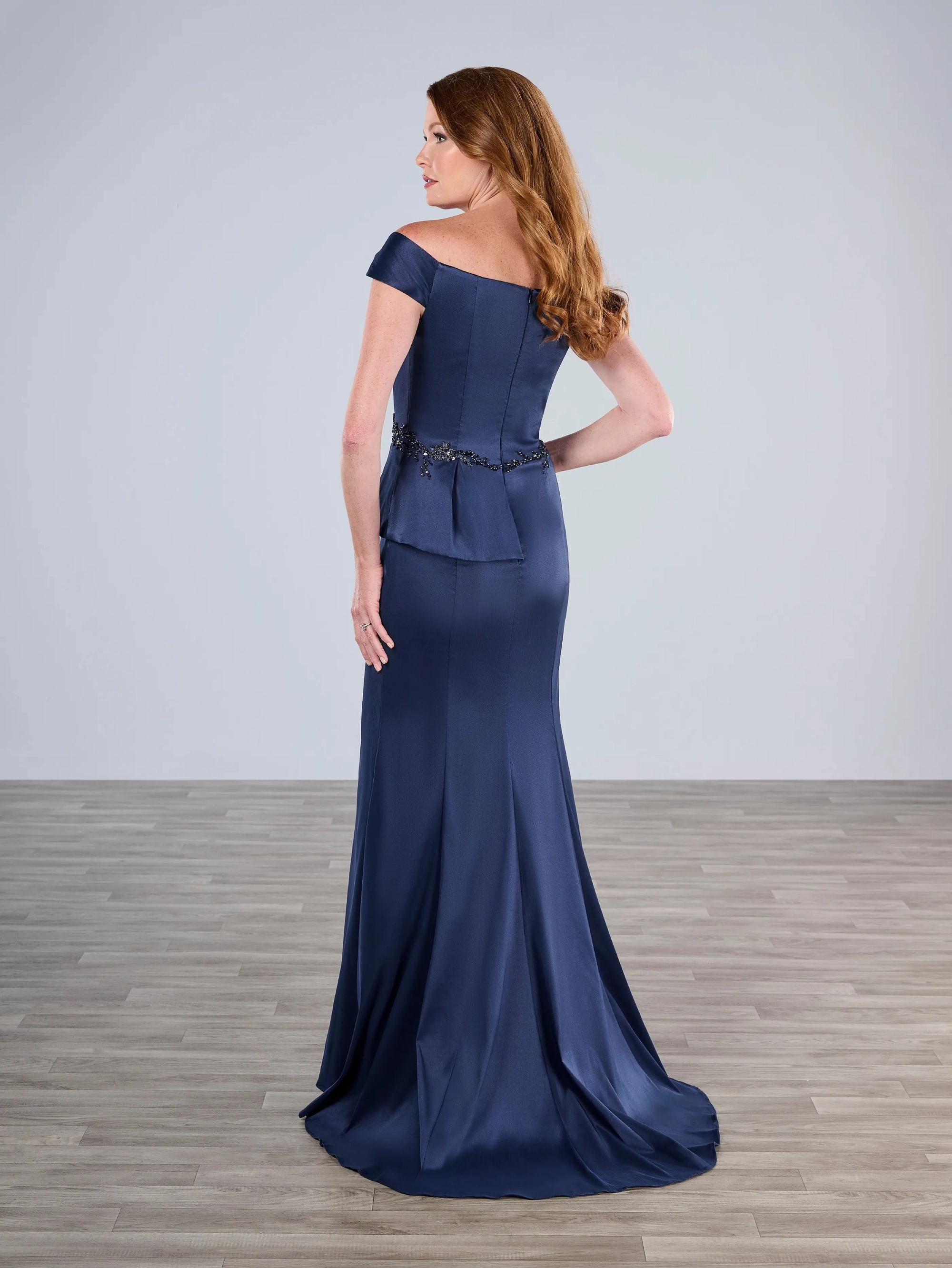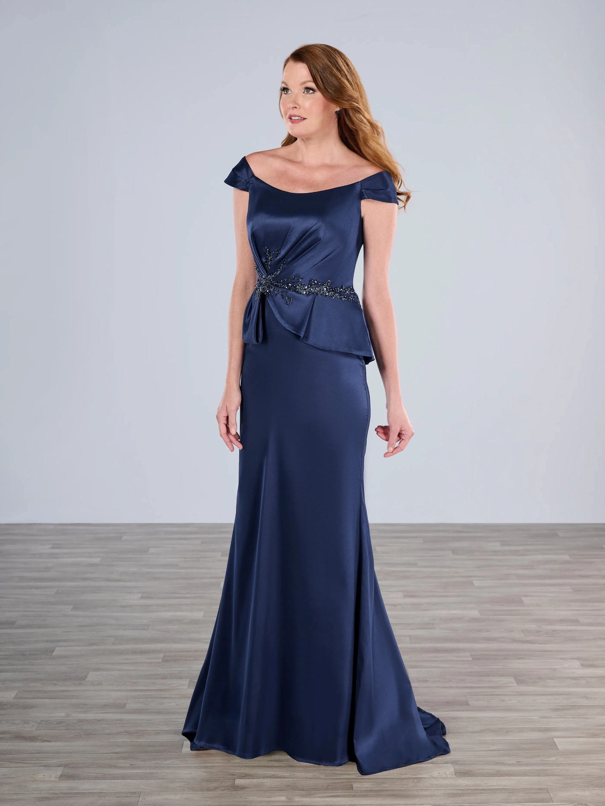 Slim style in stretch mikado with scooped neckline and off-shoulder straps. The asymmetrical top features side pleating and is decorated with a beaded motif at the waistline.