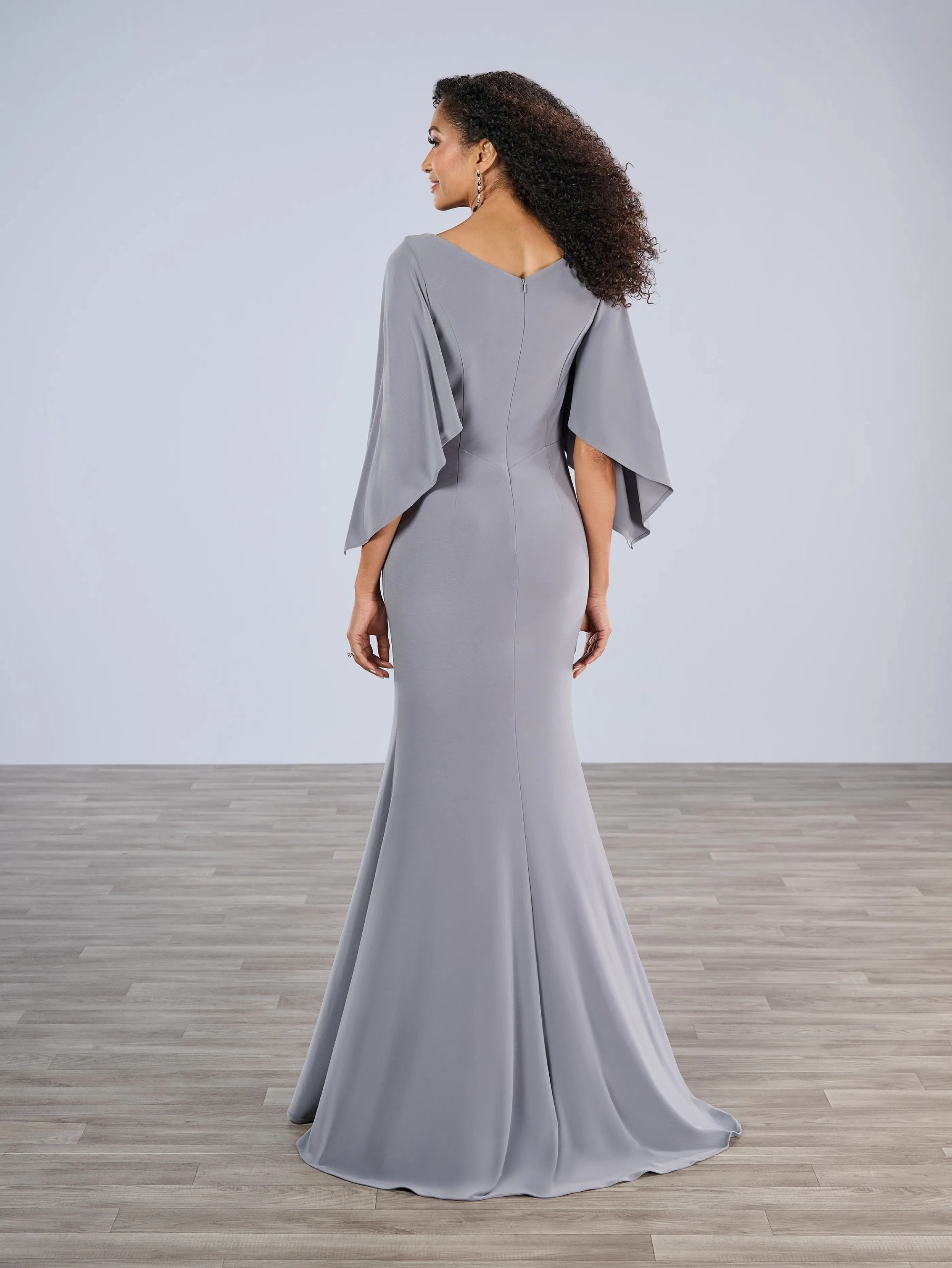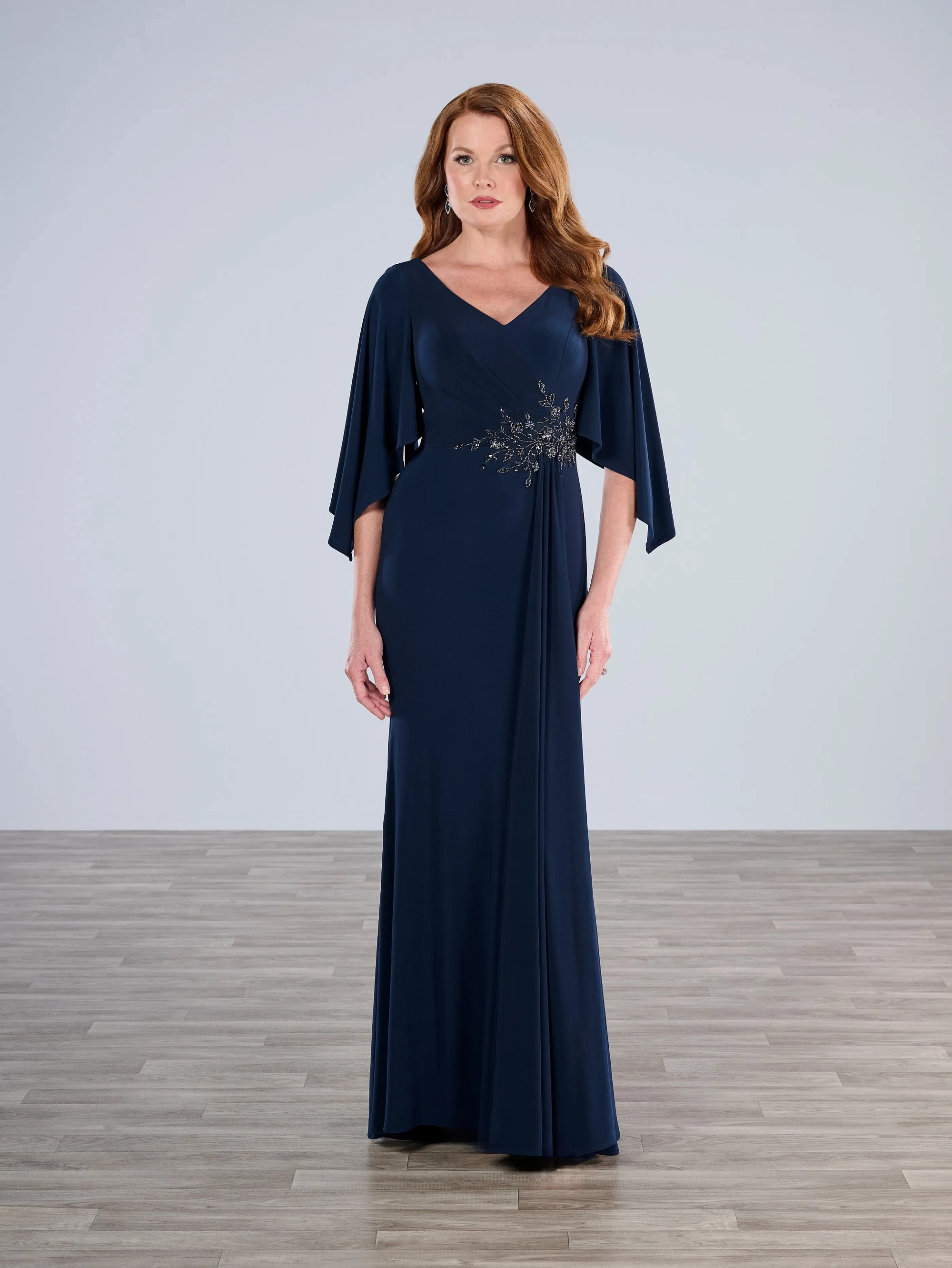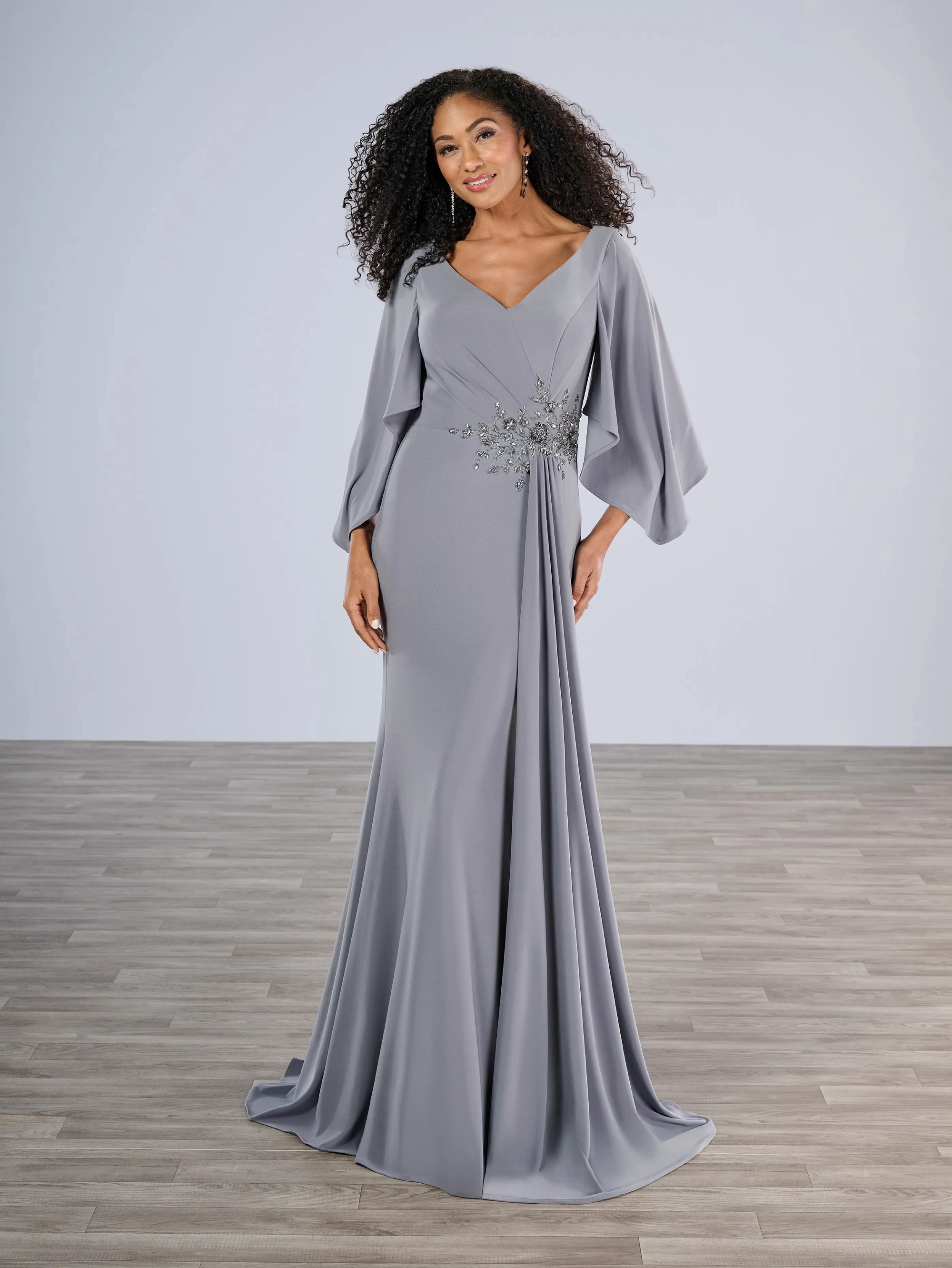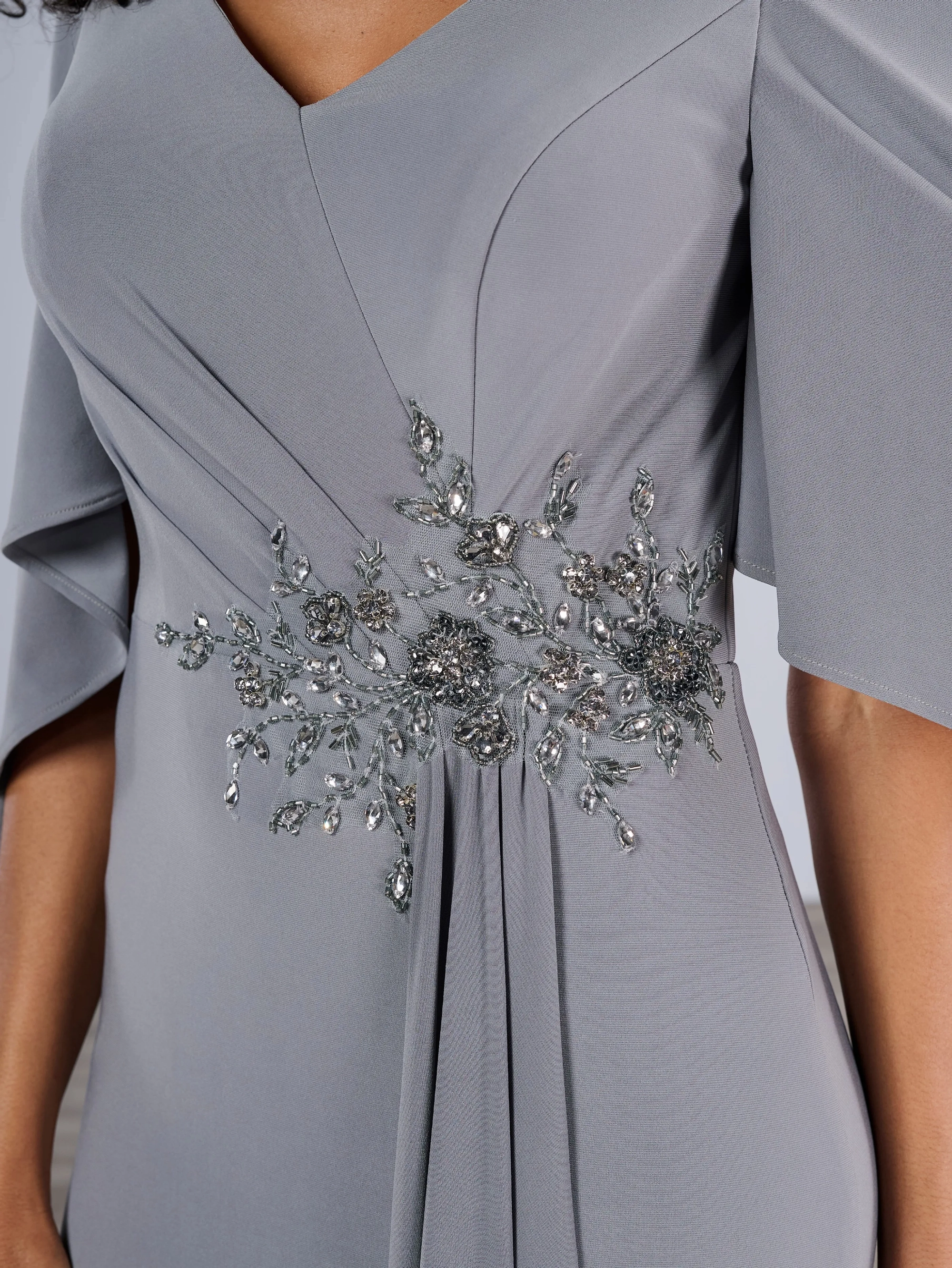 Slim jersey style with V-neck and flutter sleeves. Side draping on bodice is decorated with beaded motifs, finished with streaming pleat on side of skirt.