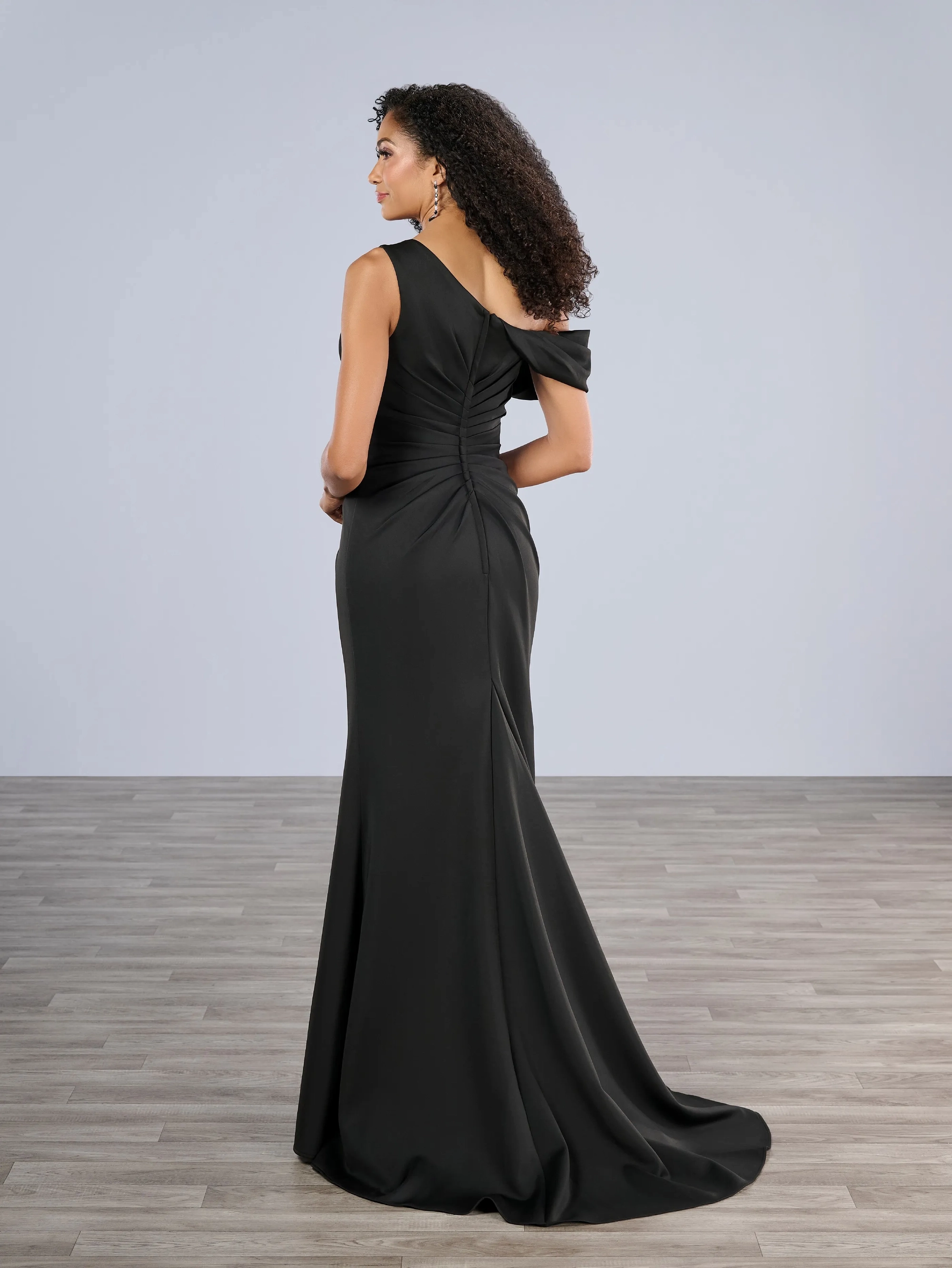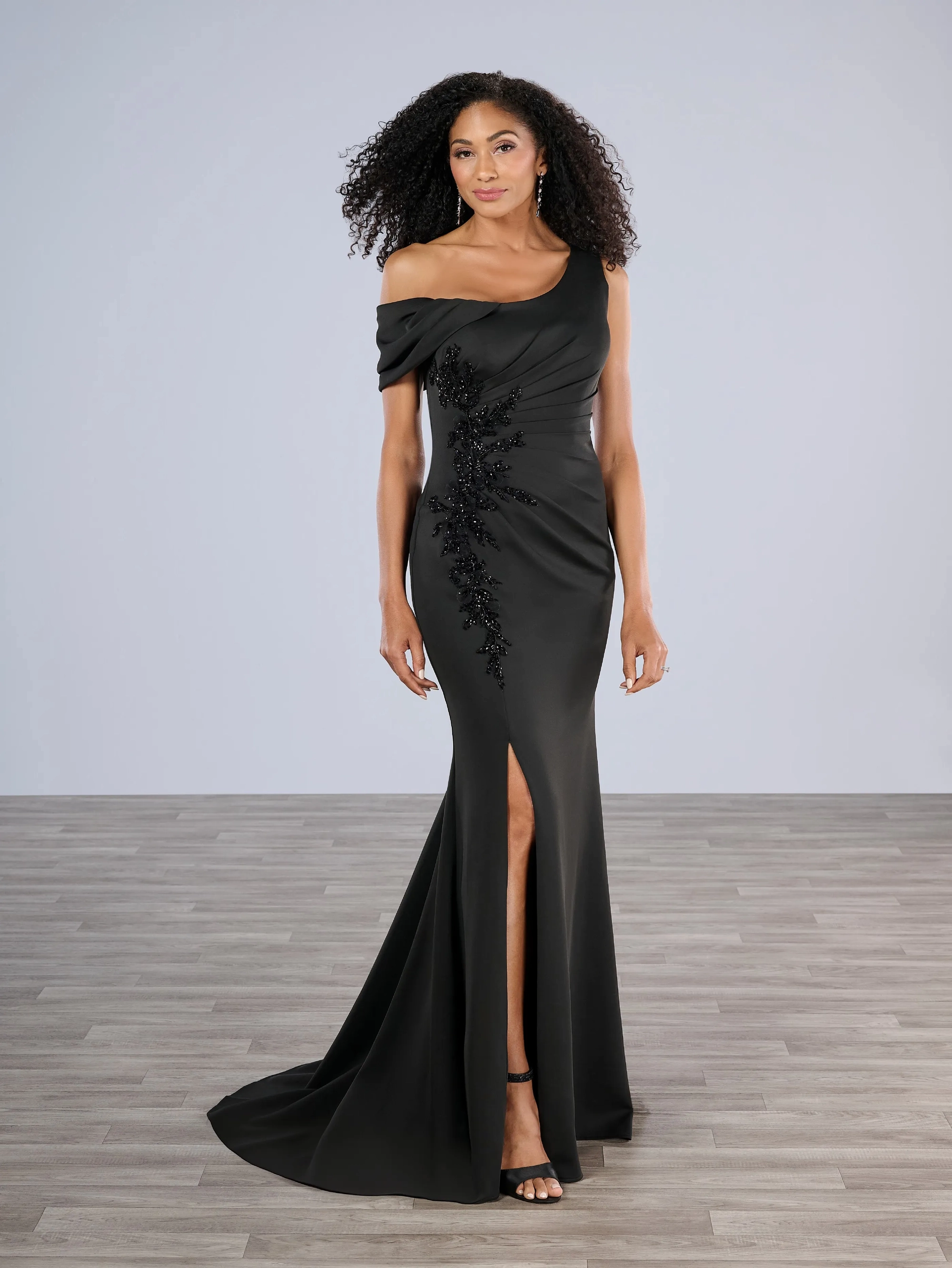 Slim gown with side draping and asymmetrical shoulder and off-shoulder strap on one side. The dress is decorated with beautiful, beaded motifs on the right front side and features a side slit.