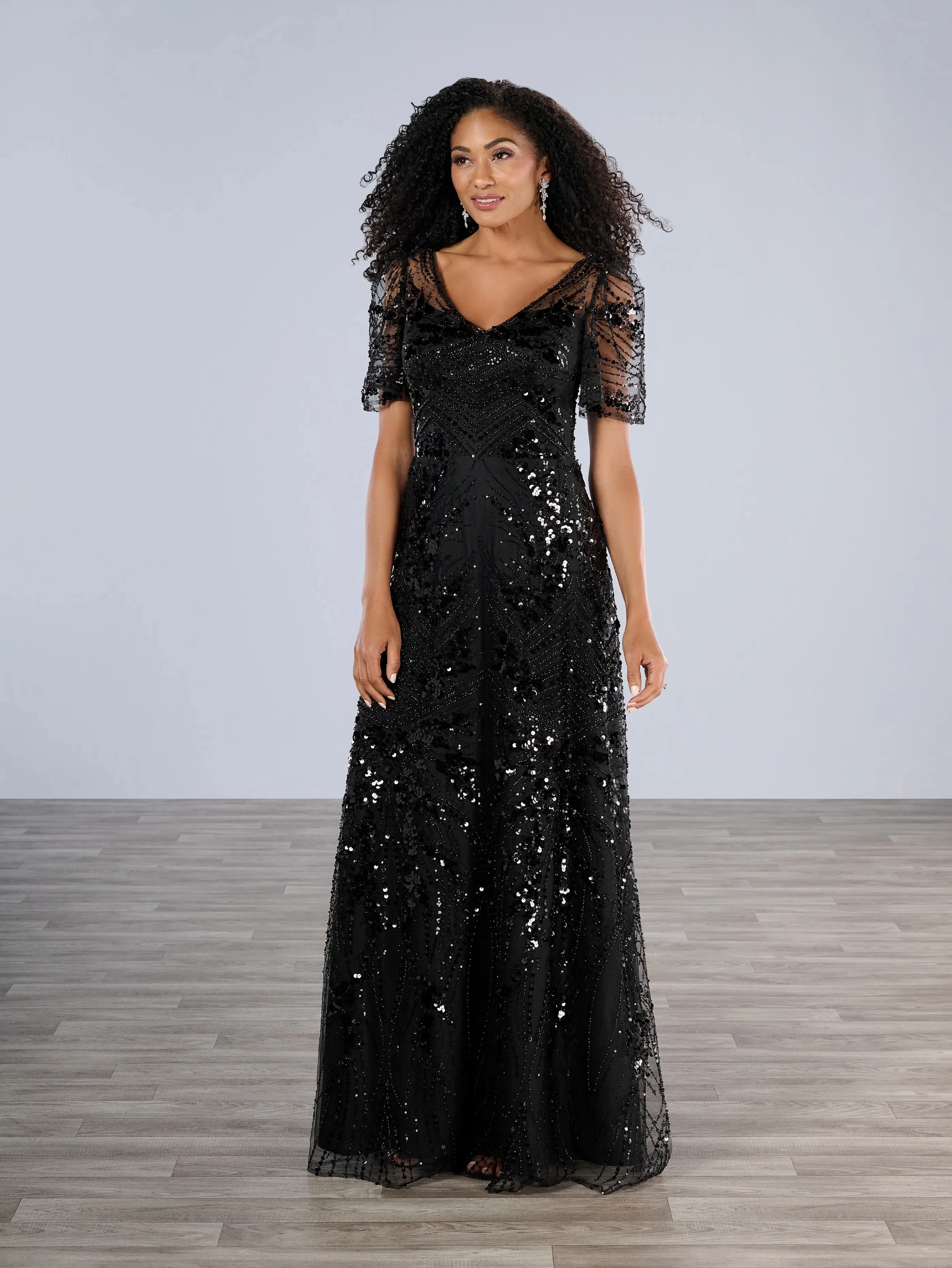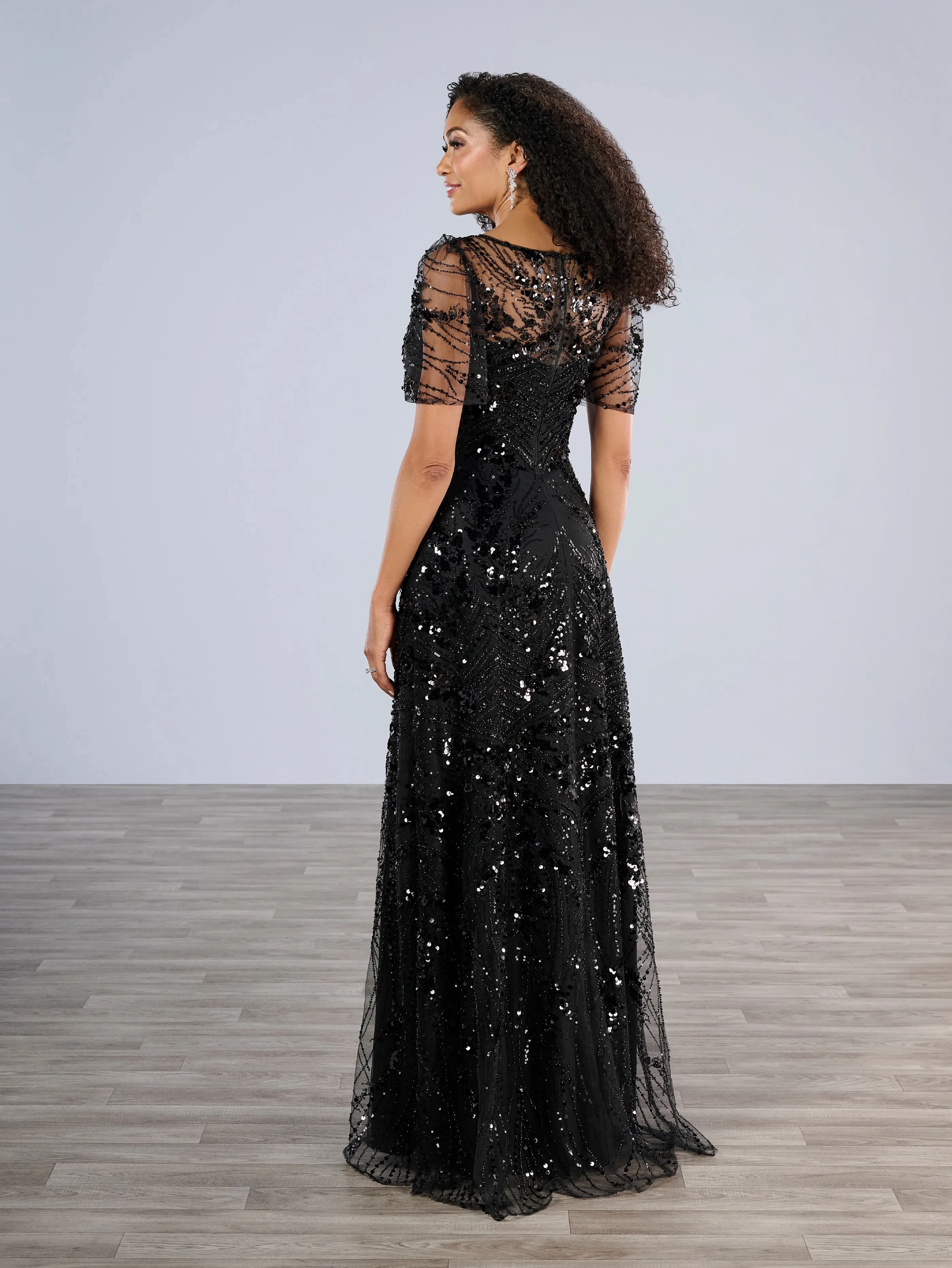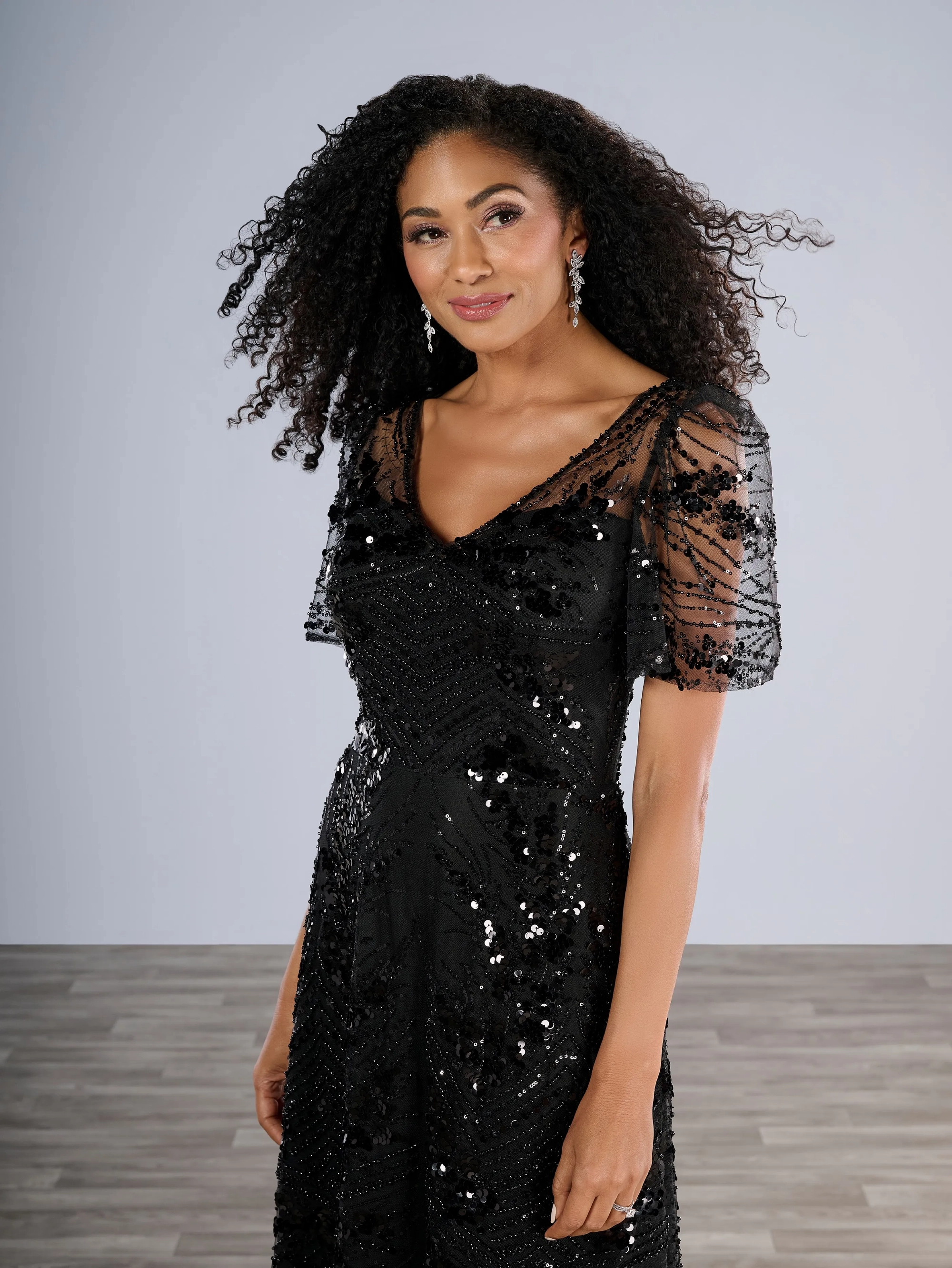 Slim A-line gown in beaded lace overlay with V-neck and short sheer sleeves.