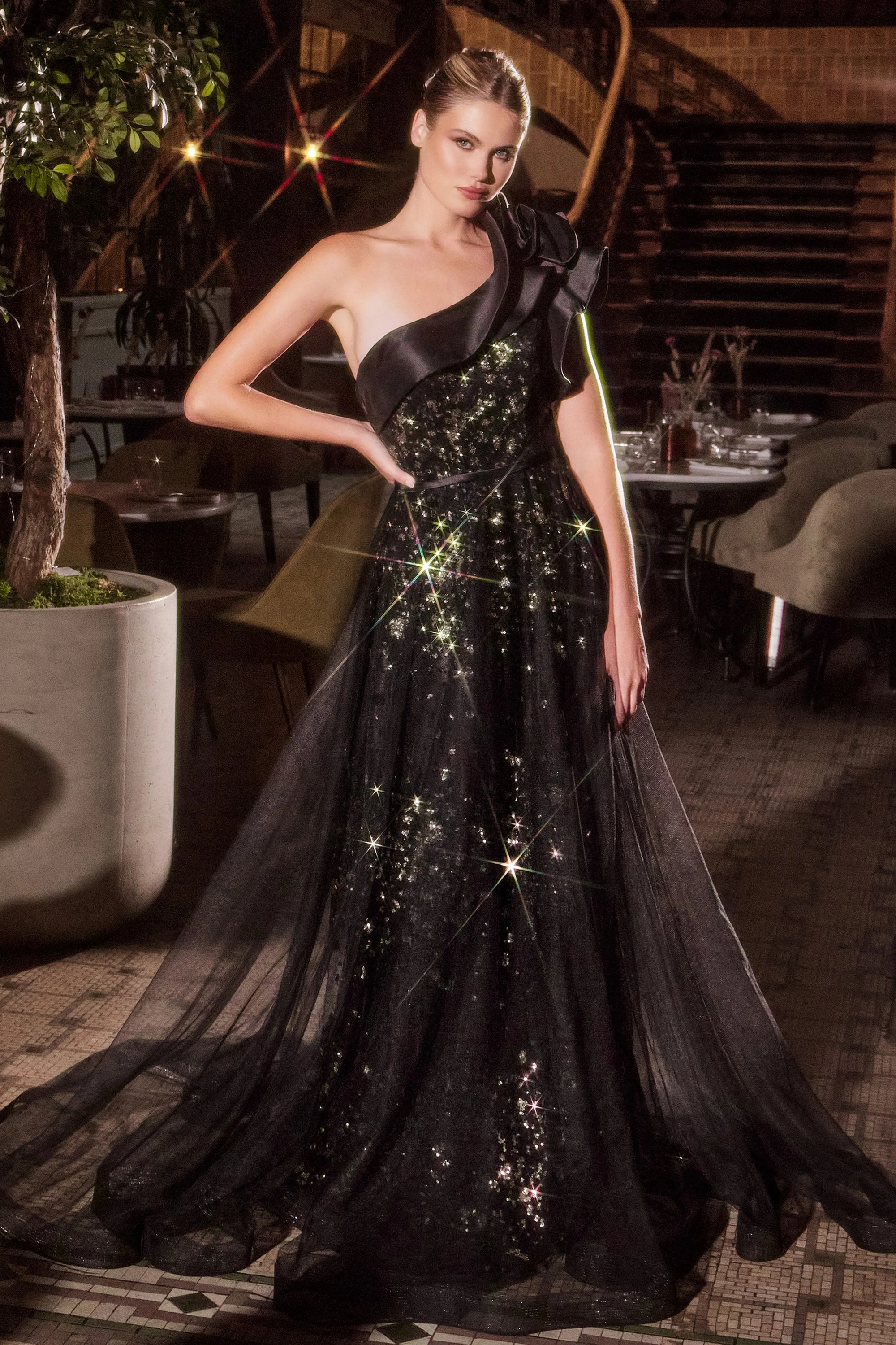 This breathtaking ball gown showcases an asymmetrical one-shoulder design adorned with a satin rosette and shimmering gold glitter detailing for a touch of opulence. Crafted with layered tulle and a structured bodice, it offers elegant support while the flowy A-line skirt moves gracefully with every step. Perfect for mothers of the bride, formal gatherings, or black-tie events, this gown embodies timeless sophistication and charm. Key Features: Silhouette: Ball gown Design: Asymmetrical one shoulder, satin rosette & gold glitter detailing Fabric & Material: Layered tulle & satin shoulder Fit Detail: Structured bodice for enhanced support, flowy A-line skirt Occasions: Ideal for mothers of the bride, formal or black-tie events