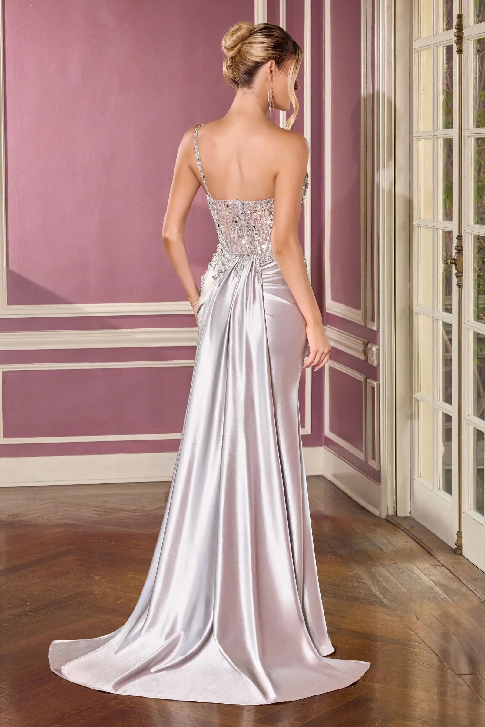 Make a lasting impression in this fitted gown designed with a sculpted illusion bodice adorned in intricate beadwork and shimmering crystal accents. The asymmetrical neckline adds a unique couture touch, while the ruched satin skirt glides effortlessly into a soft sweep train. Finished with a high leg slit and delicate beaded straps, this gown combines timeless glamour with modern sophistication—perfect for galas, red carpet moments, or prom night. Key Features: Silhouette: Fitted Design: Asymmetrical neckline with crystal and bead embellishments Fabric & Material: Beaded tulle bodice with satin skirt Fit Detail: Boned corset structure with ruched waist and thigh-high slit Occasions: Ideal for prom, galas, pageants, or formal evening events