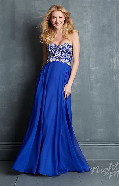 This strapless chiffon evening gown features a sweetheart neckline and an intricately beaded bodice.