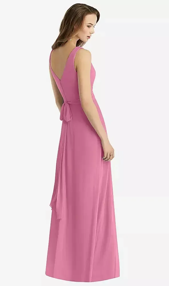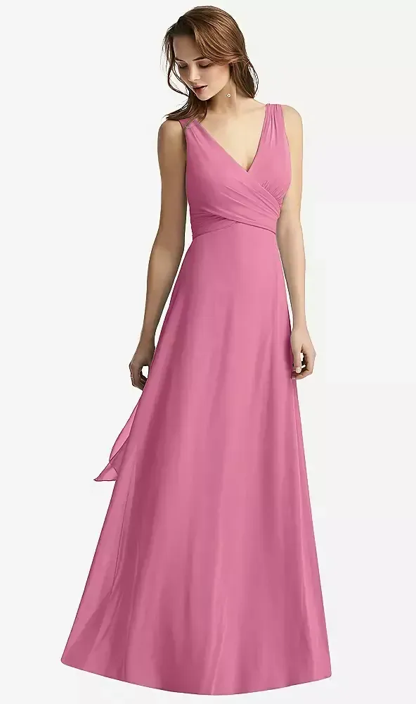 This timeless a-line showcases a v-neck neckline with sleeveless sleeves. The natural waistline creates a beautifully defined shape. Adorned with wrapped bodice, self-tie back for added detail and drama. Perfect for making an unforgettable entrance.