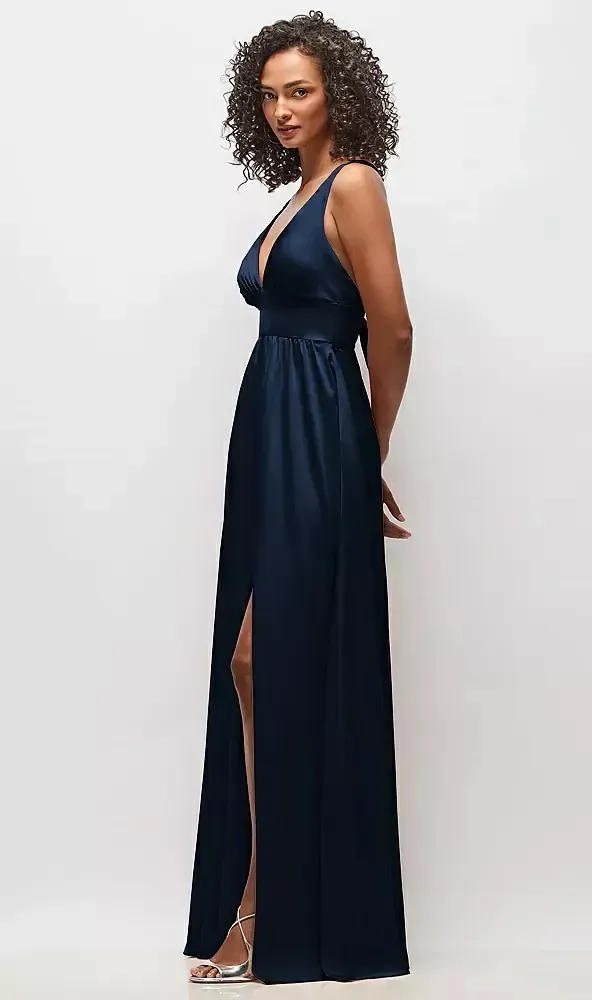 This stunning a-line showcases a v-neck neckline with sleeveless sleeves. The natural waistline creates a beautifully defined shape. Adorned with slit, pockets, criss-cross back straps, lustrous fabric for added detail and drama. The perfect blend of style and sophistication.