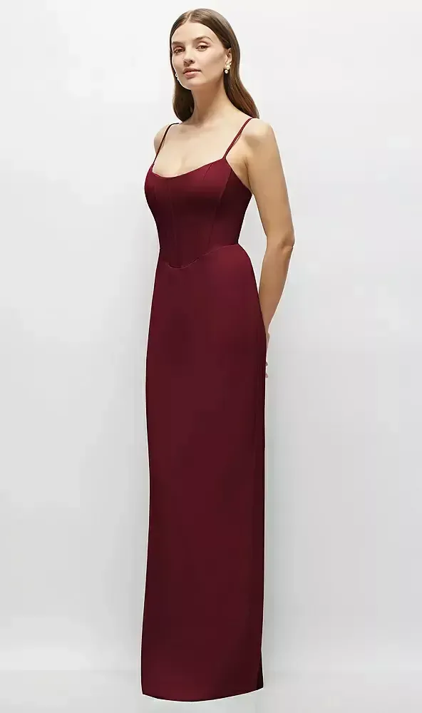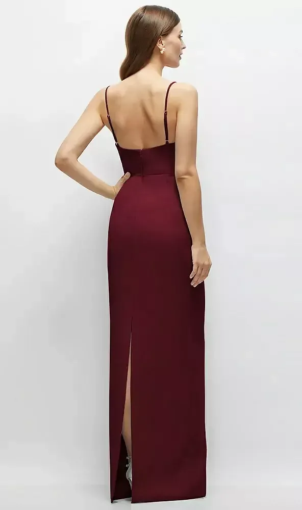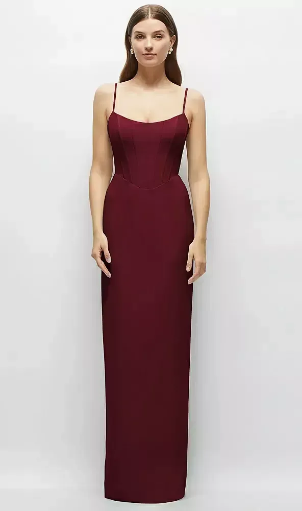 Slip into this sleek crepe column maxi dress that's cut to perfection. Its corset-inspired top gives a nod to classic couture. While the column skirt keeps things smooth and simple, with a back slit lending freedom to your stride. This crepe maxi masterpiece is finished with slender, adjustable spaghetti straps for a fine-tuned fit. It's a dress that balances timeless grace with a modern edge, making you feel unstoppable at any event.
