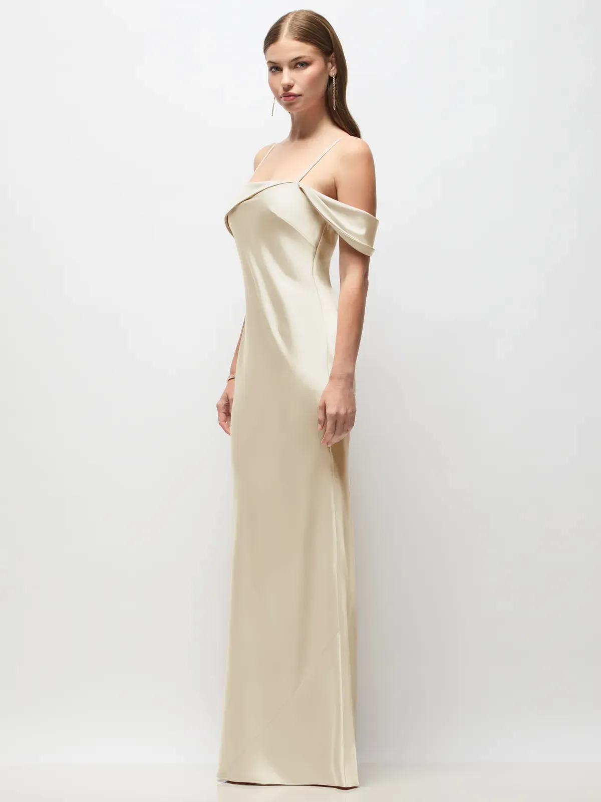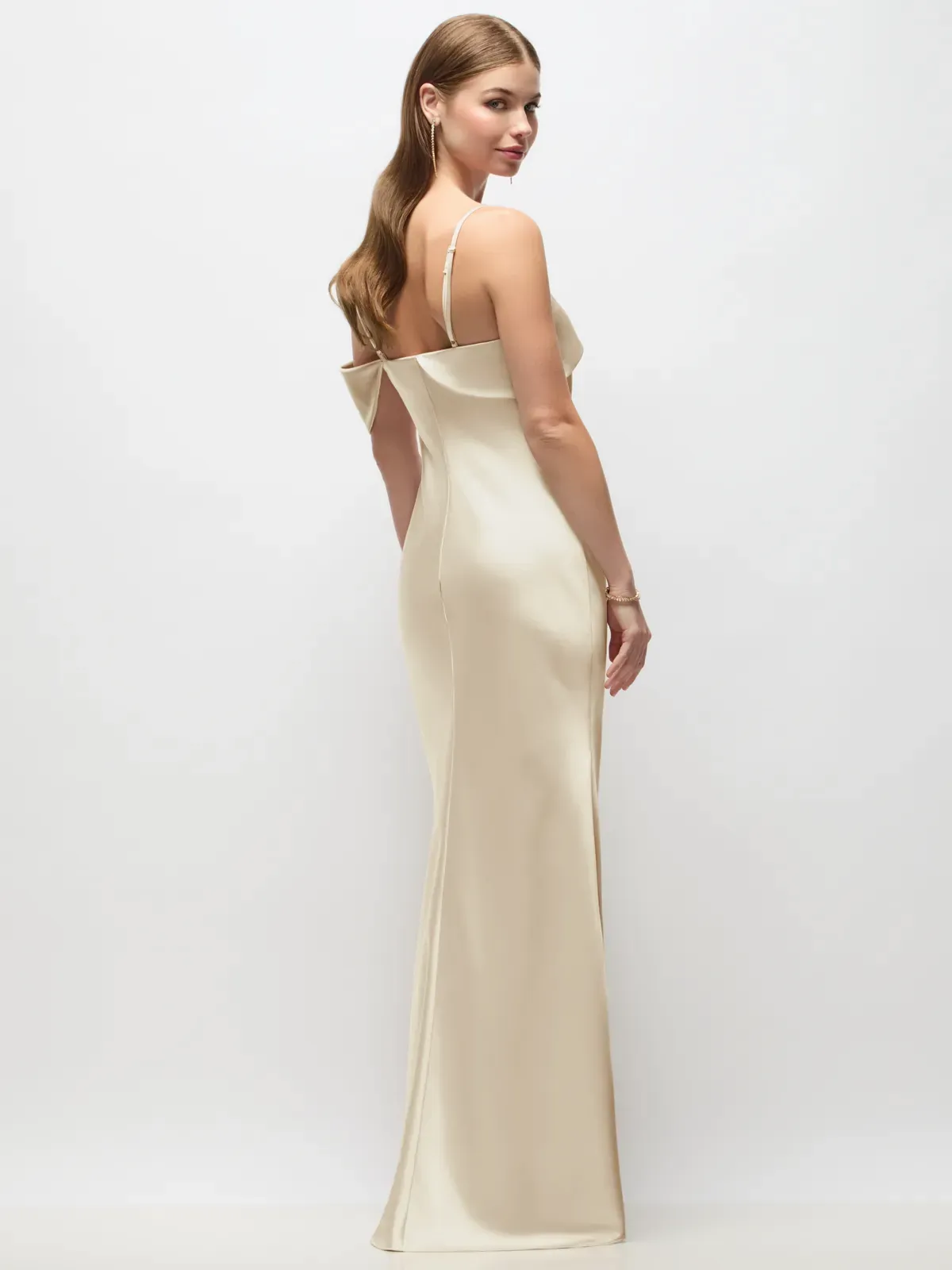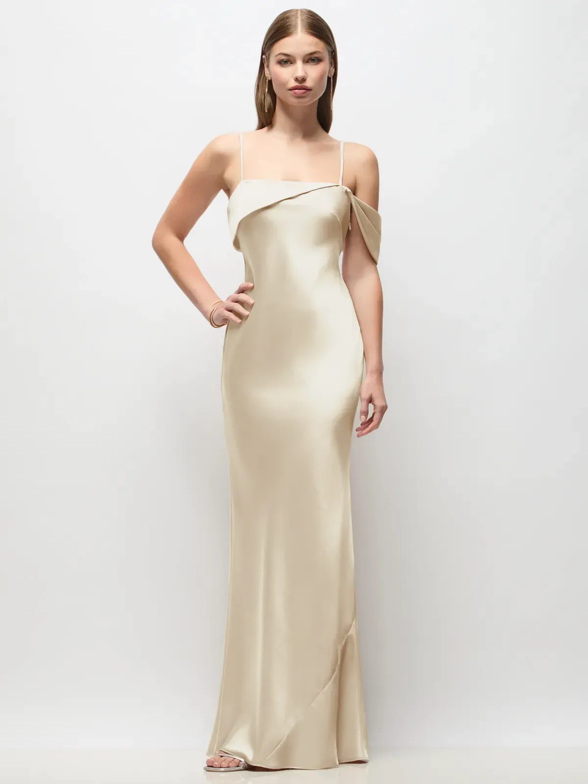 Full length Neu Stretch Charmeuse bias dress with asymmetrical cuff detail at neckline and adjustable spaghetti straps.